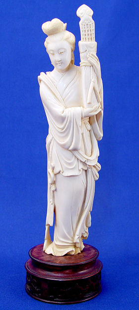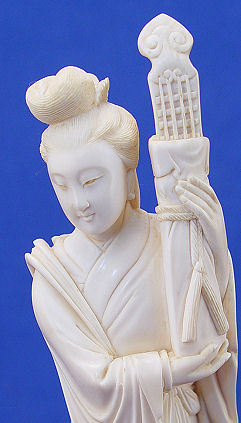 CHINESE CARVED IVORY FIGURE: Woman musician with a quan, carved from a tusk . 9''h, on a carved 1 1/2'' base.