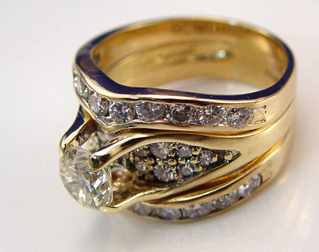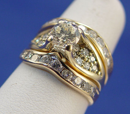 2.5CTW DIAMOND DINNER RING: Yellow gold double style ring with the center mount being a unique suspended bridge setting supporting a 90pt, removed and weighed, round brilliant diamond, purported H-I color and VS clarity, above a field of smaller diamonds. More diamonds set in outer bands, approx. 35 stones totaling approx. 2.5ct. Band marked ARC 14k BLU*Ray, size 7, 7.7 grams. Est. $3000/5000**