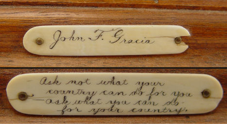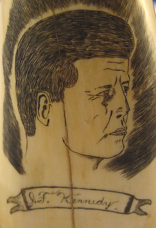 SCRIMSHAW OF KENNEDY ON WHALES TOOTH: Inscription on front ivory plaque ''Ask not what your country can do for you ask what you can do for your country'', the back ivory plaque is inscribed by the artist John F. Gracias. Age crack in the front. 4 1/2''h. the wooden base is 1''h, 6''l.