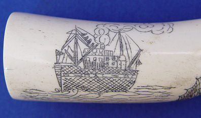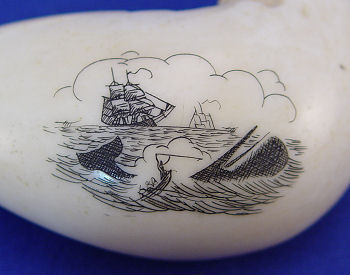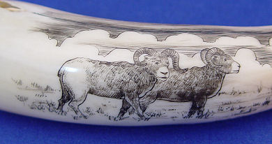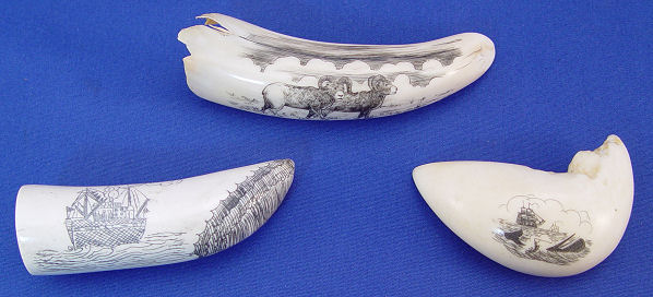 3 IVORY SCRIMSHAW: 1) Signed Yuret Shau, a 4 1/2''l. tooth with curl horn rams 2) a 3'' tooth with scene of a whale hunt 3) a 2 1/2'' piece with tall ship scene.