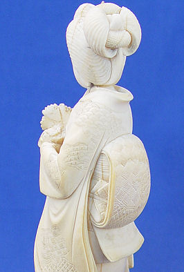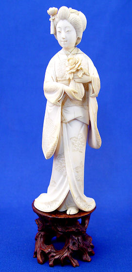 JAPANESE CARVED IVORY GEISHA FIGURE: Nicely detailed flower and hair decoration. Ivory is 6 3/4''h., the carved base is an additional 1 3/4''h.