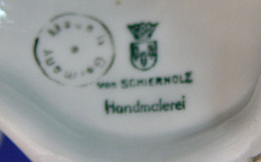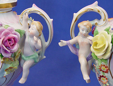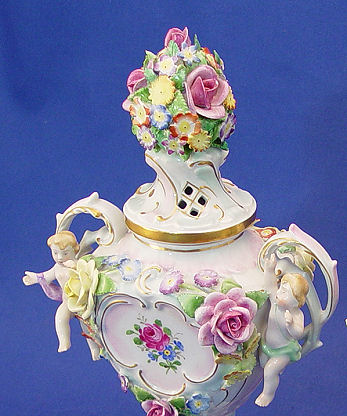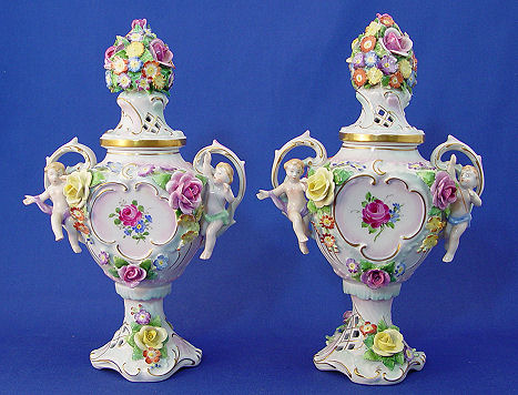 PAIR OF VON SCHIERHOLZ FINE GERMAN PORCELAIN FLOWER ENCRUSTED URNS: Covered in flowers and adorned with cherubs, reticulated covers and pedestal base. 10 1/2''h.