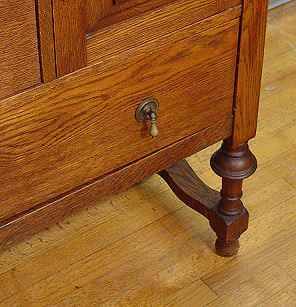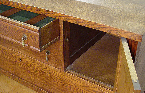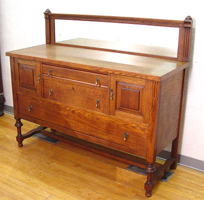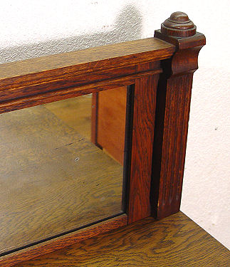 GOLDEN OAK SIDEBOARD MIRROR WITH BACKSPLASH: Arts & Crafts era sideboard the mirror framed in reeded columns. Compartmented top center drawer, cabinet door sides, full length bottom drawer. 52 1/2''h. overall, x 60''w. x 23''.