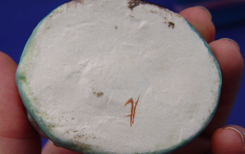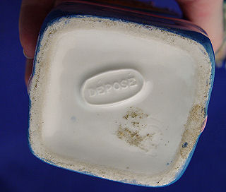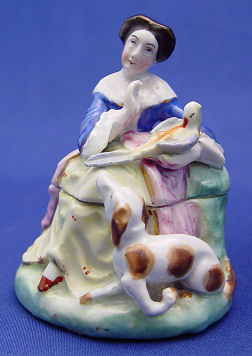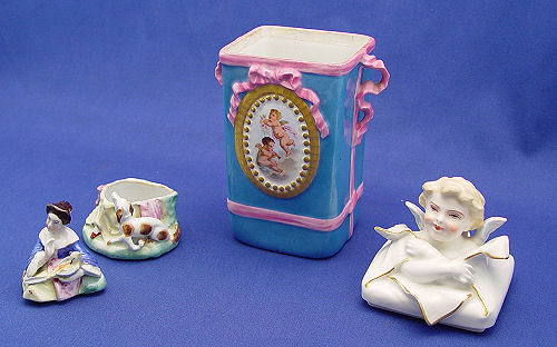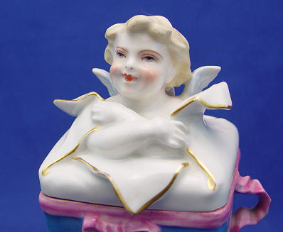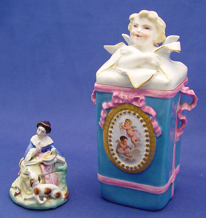CHERUB DECORATED FRENCH PORCELAIN COVERED JAR: The lid being in bust form of a winged cherub, the body having hand painted cherubs, ribbon motif handles, 8 1/2''h. Raised mark ''depose'' (registered). Sold with a bonus figural covered box of a woman with a dog. 4''h.