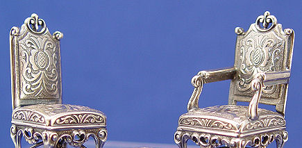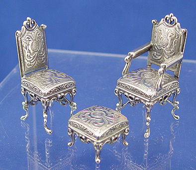 LOUIS XVI STYLE STERLING MINIATURE FURNITURE: 3 pieces, each marked 925. The chairs are 2''h, the ottoman is 3/4''h. Approx. 70 grams.