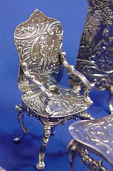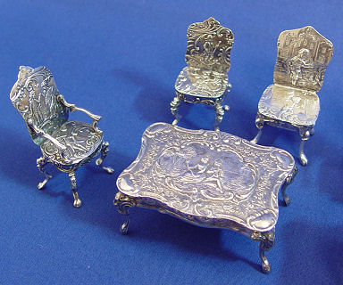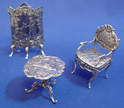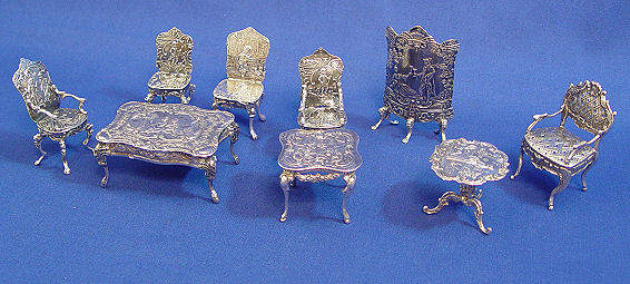 MINIATURE REPOUSSE 800 FINE SILVER FRENCH PARLOR SUITE: 9 pieces to include library table, 1 1/4''h. x 2 3/4'', pedestal tea table, 2 arm chairs, 2 side chairs, side table, and screen, 3''h.