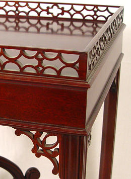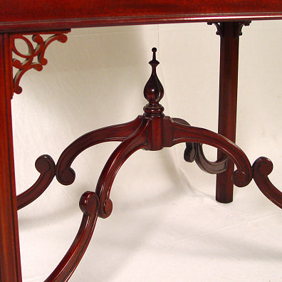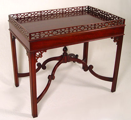 FINE MAHOGANY CHIPPENDALE STYLE SILVER TABLE: From the pierced gallery to the delicately carved finial joining the curved stretchers, this table is rich in detail. 27 1/2''h. x 32'' x 21''.