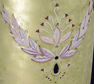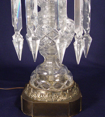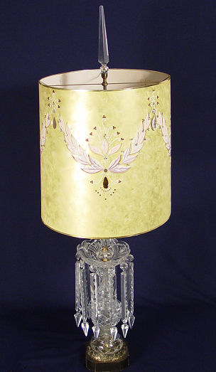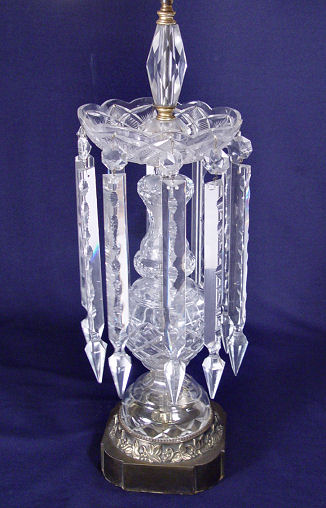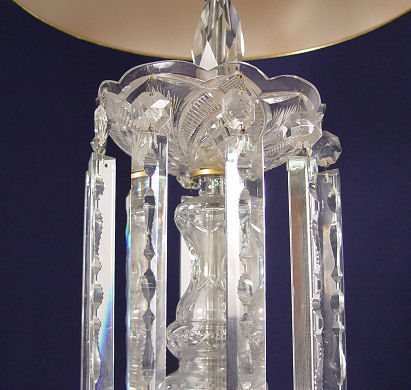 CRYSTAL TABLE LAMP WITH 12'' PRISMS: Clear cut glass lamp raised above the norm by the ten 12'' spear cut prisms attached to 1'' octagonal bead prisms hanging from the top dish. Please note at least three chips noticed at ends or edges of the long prisms. Further accented by the funky shade with cut outs for tear drop prisms and the 10'' finial. Overall 56''h.