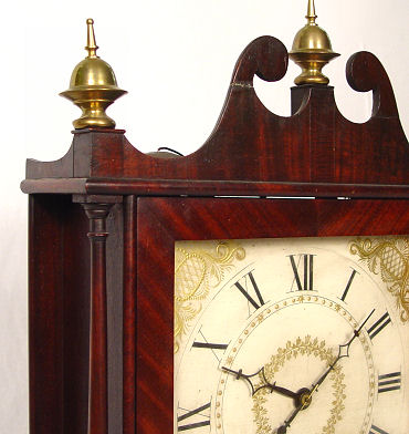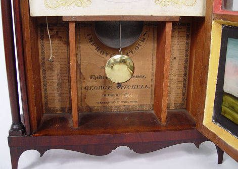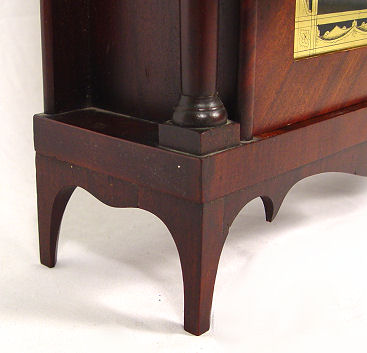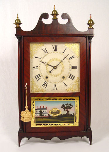 EPHRAIM DOWNES PILLAR AND SCROLL MANTLE CLOCK: Ca.1825. Appears to be all original with mahogany case, wooden works, hand painted face with Roman numerals, lead weights, key, and eglomise reverse painted glass panel. 31''h. x 16''w. x 4 3/8'' d. Est. $800/1200**