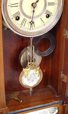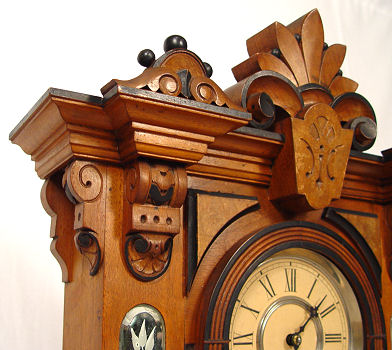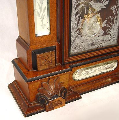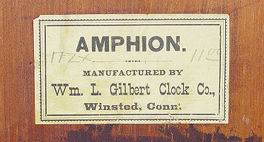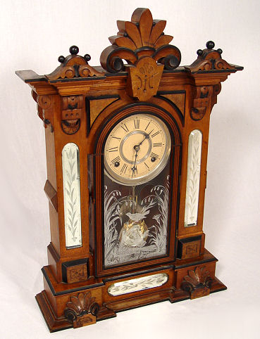 WM. L. GILBERT CLOCK CO. ''AMPHION'', C. 1885: One of Gilbert's finest mantle clocks. Cut glass mirror paneled sides and base with a nice ormolu mounted cut glass mirrored pendulum. This model has the balls on top, most do not. All original walnut case w/etched bird design on door. Full label on back. 8 day movement in working order strikes a cathedral gong. We do not get 115 year old clocks any nicer than this! 24 3/4''h. x 16'' x 5 1/4''.