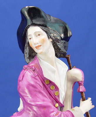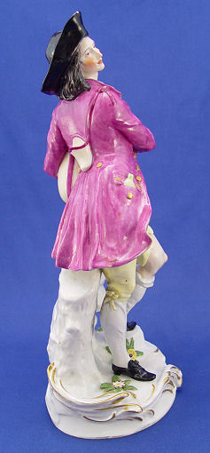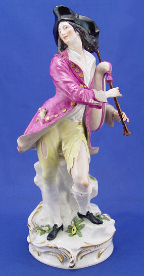 MEISSEN CABINET FIGURE: In 18th C costume and bag pipes, polychrome, blue crossed swords under glaze. 14 1/2''h. Please call for condition, a pin head size chip on hat and very small crack on upper side of base.