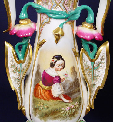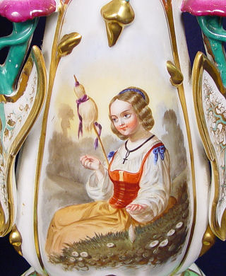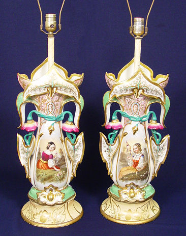 19th C PAIR OF OLD PARIS PORCELAIN VASES FITTED AS LAMPS: Porcelain vases hand painted with girls in period costume, philodendron figural handles. The wooden bases are painted to match the porcelain. Porcelain alone is 21''h.