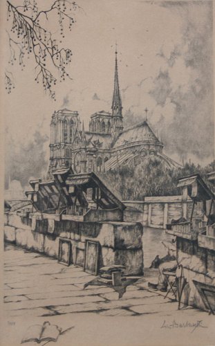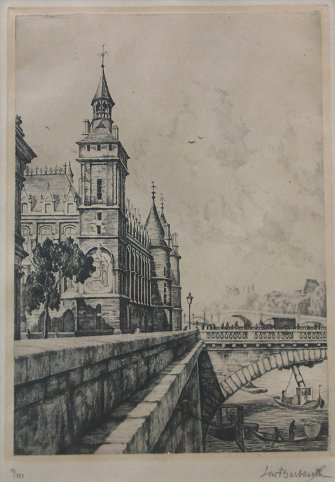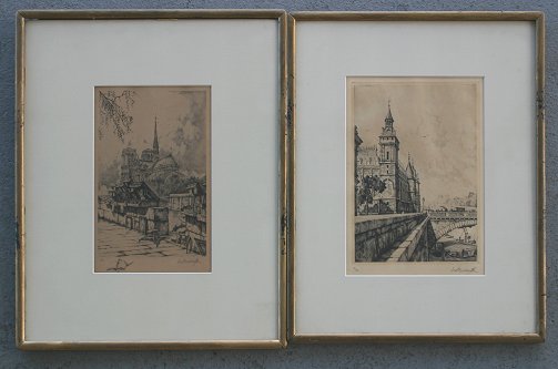 BARBASETTI, Ciro, (Italian, 20th C.): Pair Parisian Etchings, ''Art Seller'', and a city river scene, circa 1930's, 8 3/4'' x 5 1/2'', both signed in pencil LR, numbered 7/350 and 12/350, overpainted frames, 16'' x 13''.