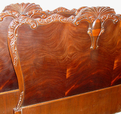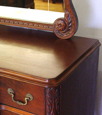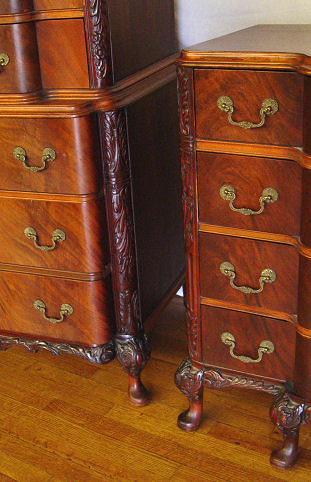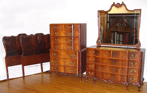 5 PIECE 1940'S FINE MAHOGANY BEDROOM SUITE: Block front chests with carved stiles. The set include 1) a PAIR of TWIN HEADBOARDS, 48''h. 2) 8 drawer HIGH BOY CHEST, 58''h. x 35'' x 21''. 3) a 5 drawer CHEST, 35''h. x 52'' x 22''. and 4) and the matching ornate wall hanging MIRROR framed in mahogany, 43'' x 42''. There are no makers names, excellent condition.