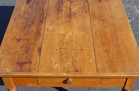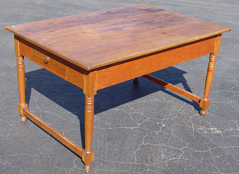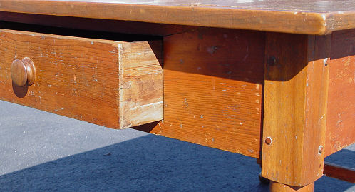 PERIOD AMERICAN COUNTRY WORK AND KITCHEN TABLE: Pine and mixed wood, the top is constructed of three planks, the base has side stretchers, peg and dovetail construction, with a drawer at each end. 32 1/2''h. x 58''w. x 39''d. Est. $700/800**