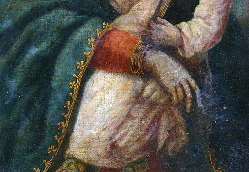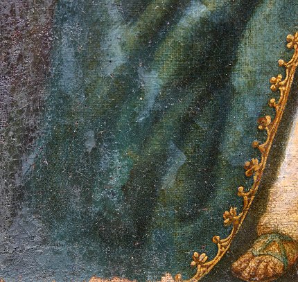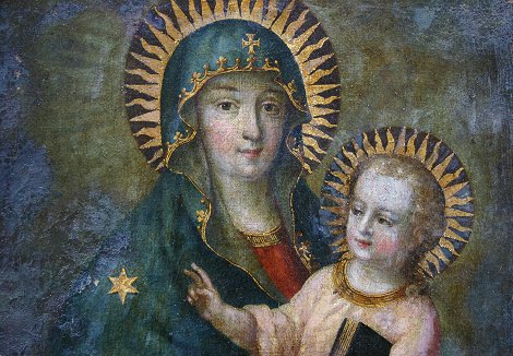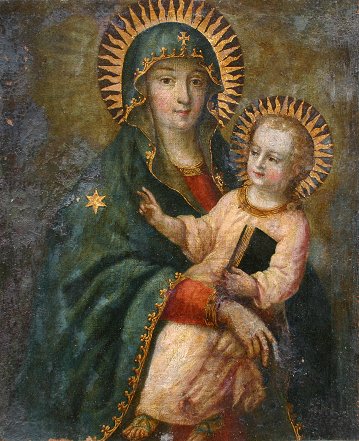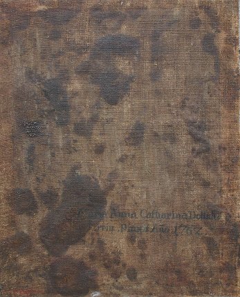 18TH C MADONNA AND CHILD: Good quality, but poor condition, unstreched, 15 1/2'' x 12 1/2'', stencil verso, ''Mama Anna Catharina Dollich?'', painted in 1762.