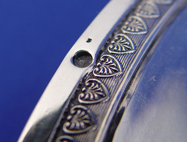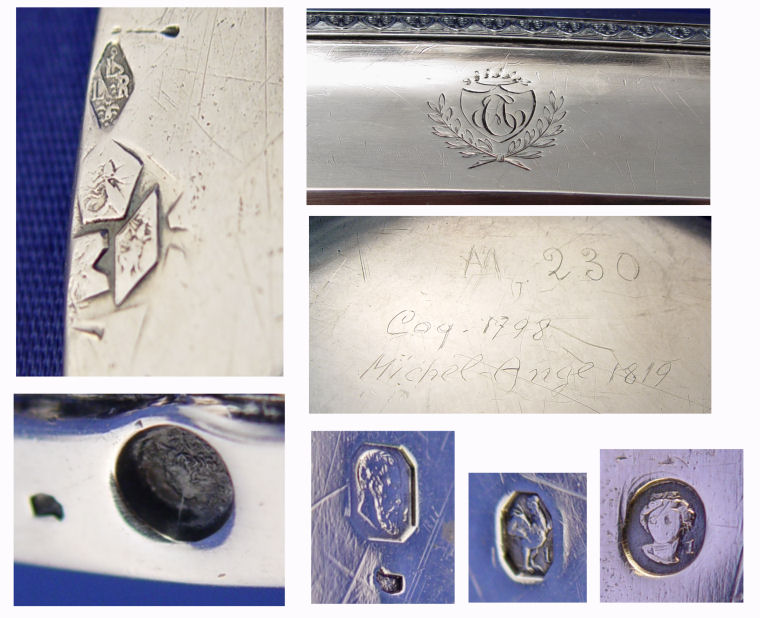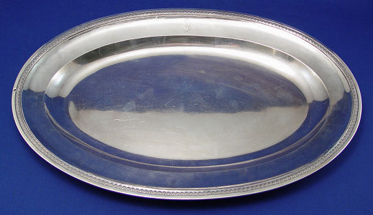 FRENCH STERLING MEAT DISH: Paris First Standard 1798-1809. Oval shaped platter with wide molded border, engraved with coat of arms monogram. 20 1/4''l. approx. 1864 grams, (59 oz.).