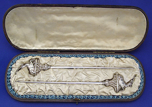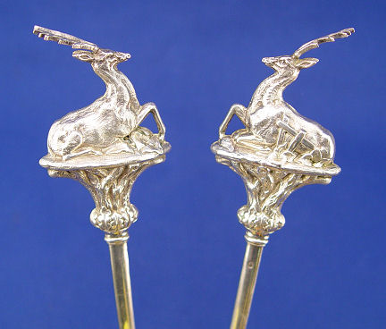 FIGURAL FRENCH 950 FIRST STANDARD SILVER SKEWERS: Each skewer surmounted by a full body stag. 10 1/2''l. In the original presentation box.
