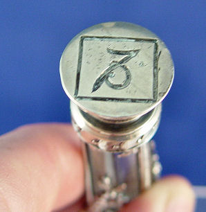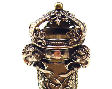 AUSTRIAN 800 SILVER & CRYSTAL SEAL BY GEORG ADAM SCHEID: Wonderfully detailed work surmounted by an open crown with three ram heads to band, floral swags to sides and matching design to side bars and end rings, pedestal bottom support to actual seal. Touch marks to base and bottom of glass framing denote maker as Georg Adam Scheid of Vienna Austria-Hungary, dog head standard mark for .800 silver, ca 1886-1921. Approx. 3 1/4''h. Est. $400/600**