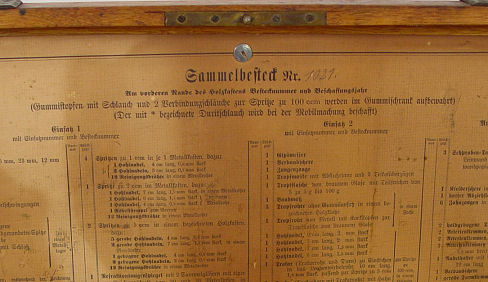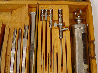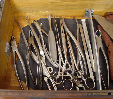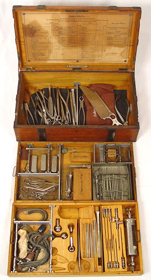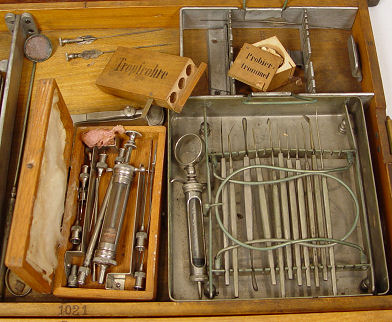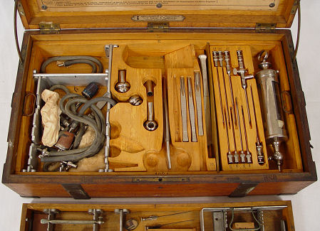 JETTER & SCHEERER PORTABLE DENTAL SURGICAL KIT: Oak carry case filled with three trays full of tools. The inventory list is on the original paper on the inside of the lid. The metal clad oak box is 5 1/2''h. x 20'' x 11 1/2''. Ca. 1885 Est. $1800/2000**