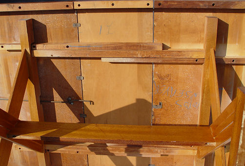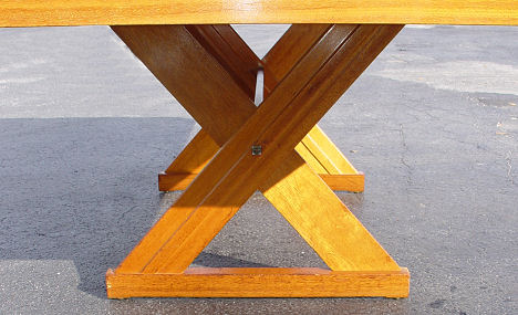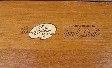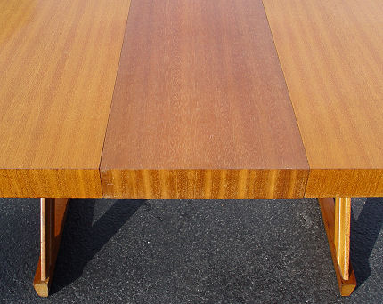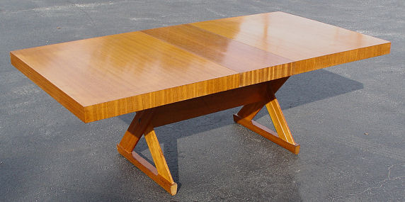 DINING TABLE BY PAUL LASZLO FOR BROWN SALTMAN, CA 1950's: Marked on underside Brown-Saltman California Original Design by Paul Laszlo. 66'' x 42'', plus two 15'' leaves. One leaf with missing veneer to edge.