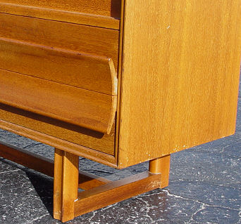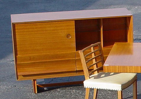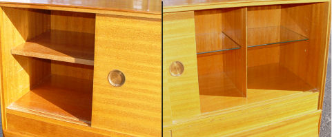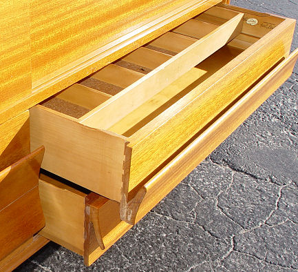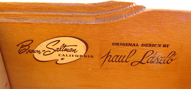 SIDEBOARD BY PAUL LASZLO FOR BROWN SALTMAN, CA 1950's: With two sliding doors above three Drawers. Behind the sliding doors are three sections, one with wood shelf and two smaller sections with glass shelves. One drawer is fitted with a sliding cutlery tray. Marked on inside of cutlery drawer Brown-Saltman California Original Design by Paul Laszlo. Marked verso 1-1756 Buffet, 60''w. x 19 1/2''d to front of flared handles, 38''h.