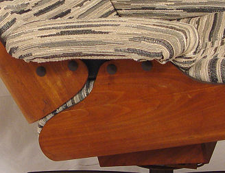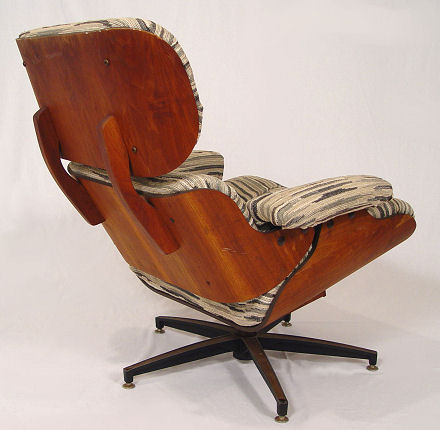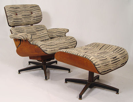 CHARLES EAMES TYPE LOUNGE CHAIR AND OTTOMAN: Later nubby upholstery tufted with woven leather buttons, back of chair 33 1/2''.