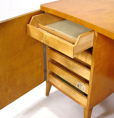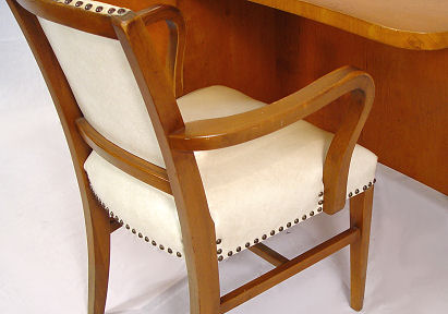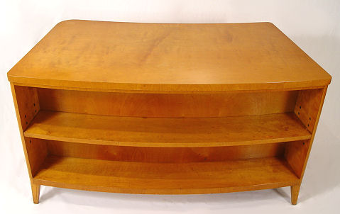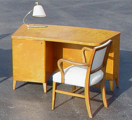 MODERNE BOOKCASE DESK WITH ARM CHAIR & LAMP, PAUL LASZLO ATTRIBUTION: Front of the desk is curved and is the two shelf bookcase with the center shelf being adjustable. Open ended seating area with single locking door behind which are five sliding tray type drawers. Desk top 53'' x 26''d., 29''h. Sold with matching arm chair, cream vinyl? upholstered seat and back, 23''w. x 33''h. at back top. Also a brass desk lamp with goose neck support. Sold as a lot.