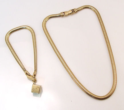 14K YELLOW GOLD SNAKE LINK NECKLACE AND MATCHING BRACELET: 15'' necklace and 8'' bracelet, the bracelet has a gold cube suspended from the end (16.5 grams). Overall 71 grams total, clasps on both marked 14k.