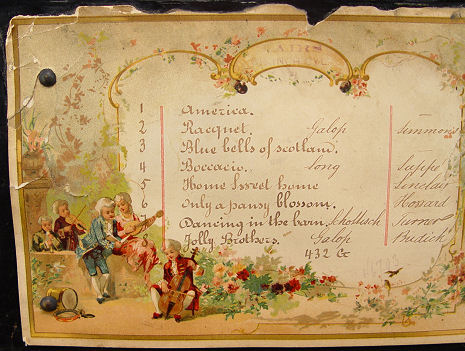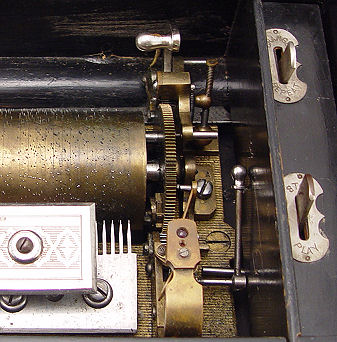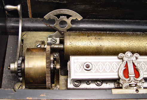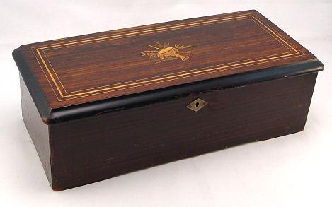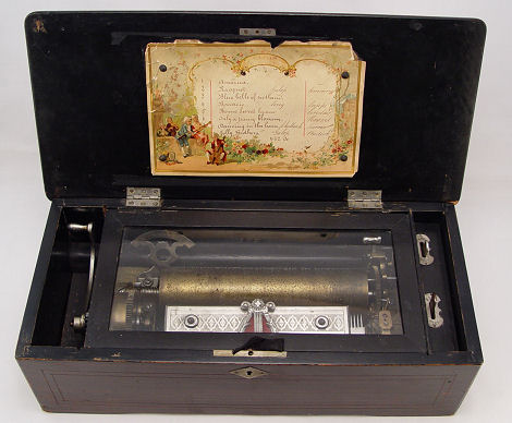 SWISS CYLINDER MUSIC BOX: The original litho paper on the interior lists the 8 tunes. The cylinder is 8 1/8''l. In good working order. The hinged lid centers an inlaid musical instrument design.