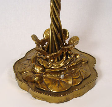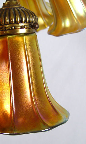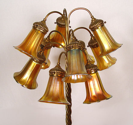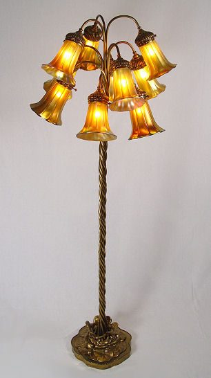 STEUBEN AURENE SHADES ON A GAT TIFFANY TYPE FLOOR LAMP: 10 shades in gold Aurene, 6 of them are signed. The water lily motif floor lamp is of high quality, though later than the shades. 58''h. 22'' span. Est. $2500/3500**