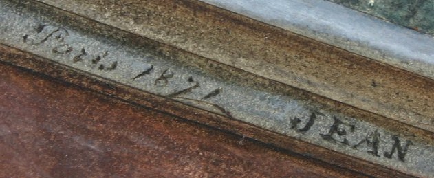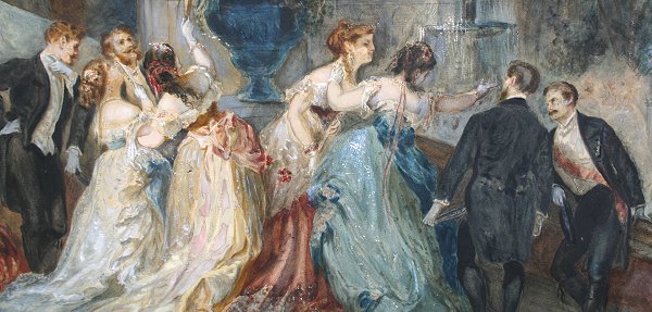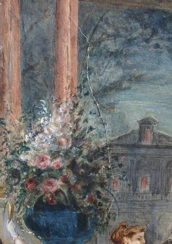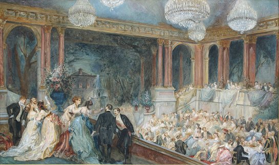 LARGE 19THC BALLROOM PAINTING SIGNED JEAN: W/C, sight size 22'' x 37'', signed LR Jean, Paris, dated 1871, worn gilt frame, 36'' x 51''.
