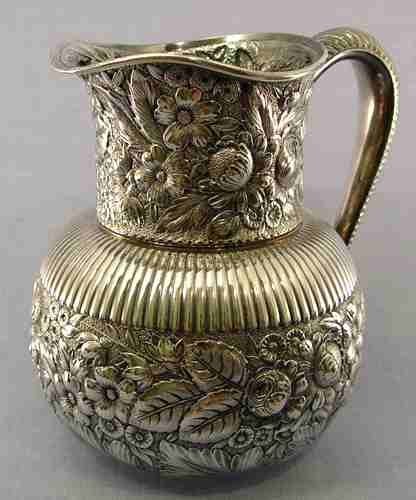 GORHAM STERLING REPOUSSE WATER PITCHER Ca. 1888: Gorham backstamp and star date mark for 1888. Repousse neck and body, 7 1/4''h. Approx. 686 grams. or 22.05 oz.