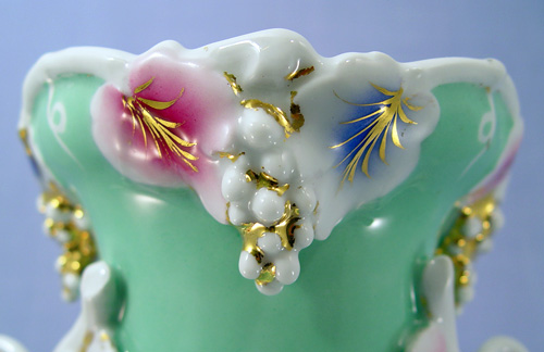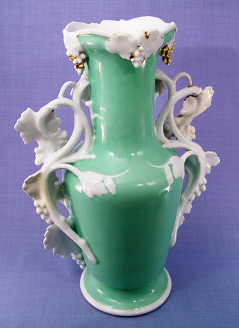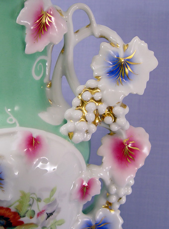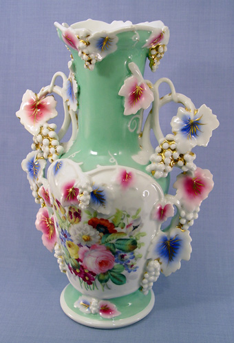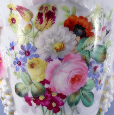 MID 19TH C OLD PARIS FRENCH PORCELAIN VASE: Hand painted floral design, double handles in leaf and grape form. Minor gold loss. 16 1/4''h. 11 1/2'' at the widest. Est. $700/900**