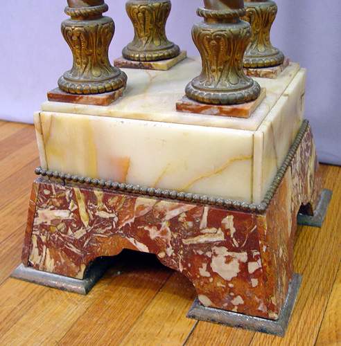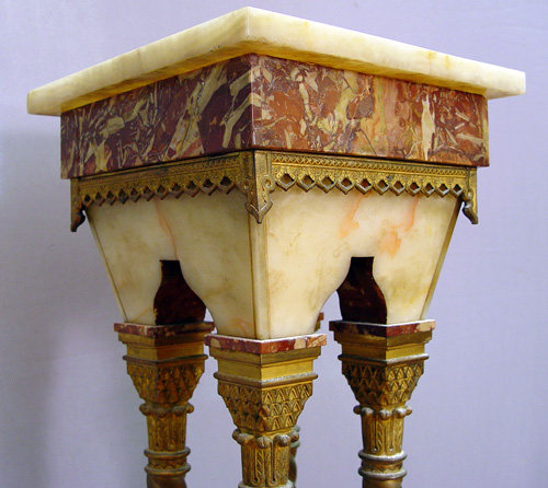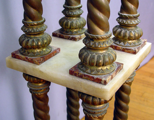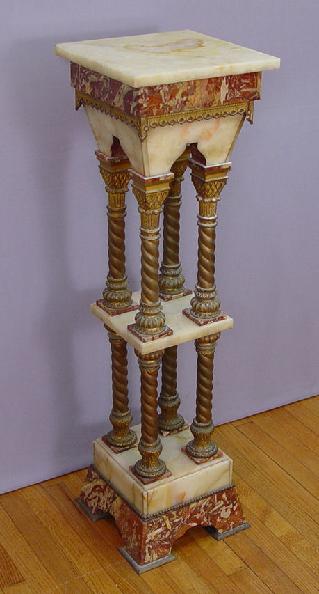 AESTHETIC MOVEMENT BRONZE AND MARBLE STAND: Egyptian revival with gilded bronze, brass, marble and onyx columns and tiers. 44''h., 12 ½''square top. Est. $600/800**