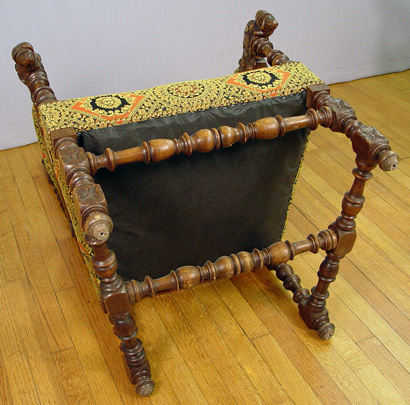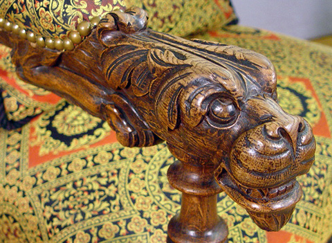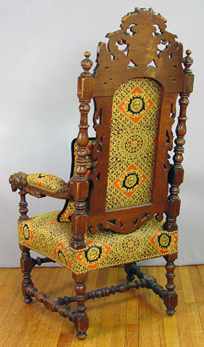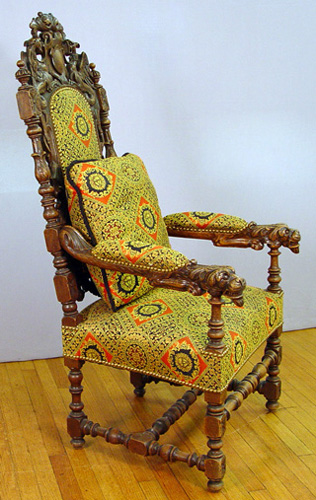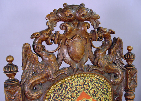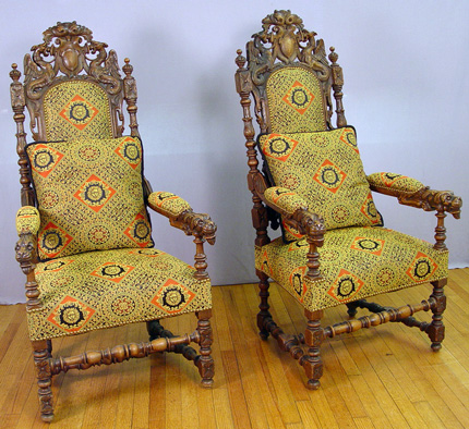 PAIR OF RENAISSANCE REVIVAL CARVED OAK ARM CHAIRS: English, CA. 1875-1900. Carved top rail with shield centered by gryphons, figural carved arm hold, blocked feet on turned legs. Upholstered back, seat and arm rests, sold with matching pillows. 53 1/2''h. X 26''w X 25''.