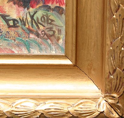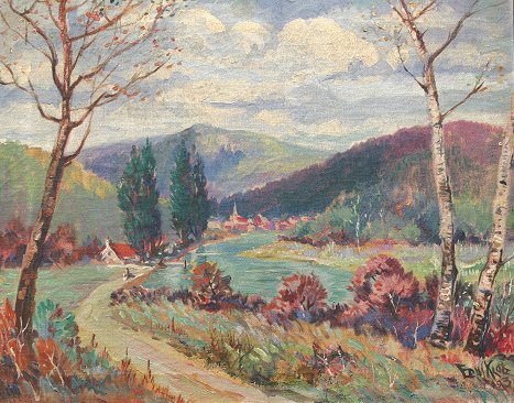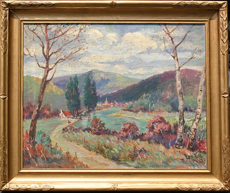 KLOTZ, Edw., (American, 20th C.): Mt. Valley Landscape, O/C, 20'' x 25'', signed and dated 1931, carved and gilded period impressionist frame with overpaint and wear, 25'' x 30''. Needs cleaning.