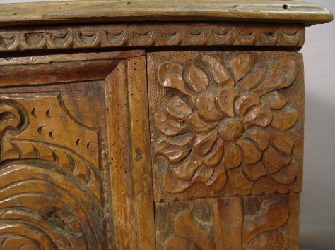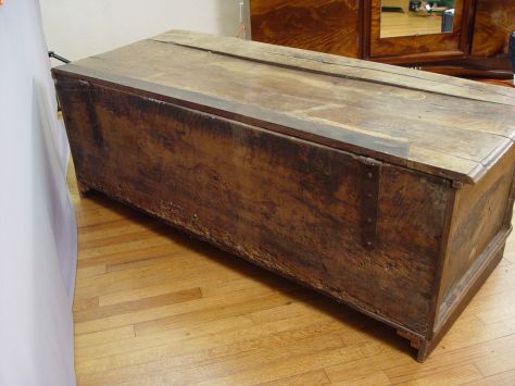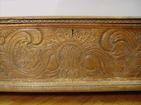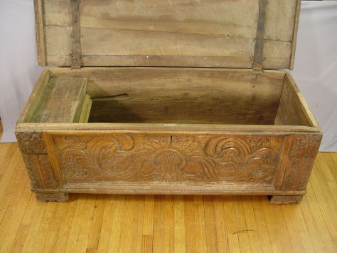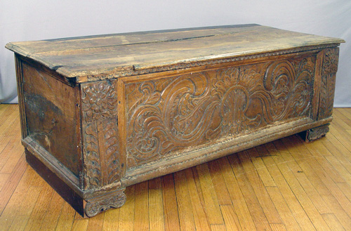 EARLY 18TH C CARVED COFFER: Probably of Germanic or Flemish origin. The front panel is covered in chipped carving. Leg supports have been added, termite treated throughout family ownership, the top is split in several places. 23'' x 63'' x 26''