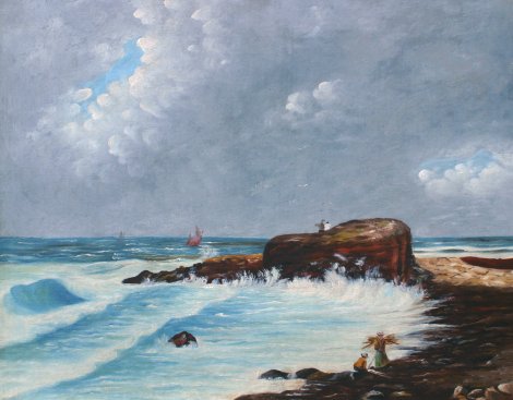 19th C. PRIMITIVE NEW ENGLAND COASTAL PAINTING: O/C, 16'' x 20'', monogrammed E.H. and dated '93, gilt frame with wear, 19'' x 23''. Patch verso, cleaned and ready to hang in your collection.