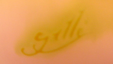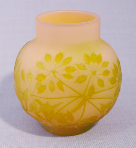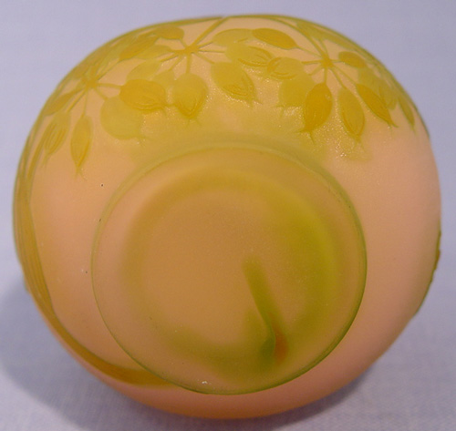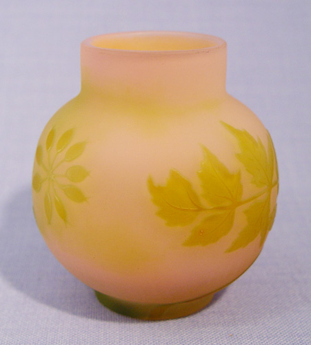 GALLE FRENCH CAMEO ART GLASS VASE: Layered and cut green to rosy peach, signed. 3 1/2''h. 3 1/4''dia.