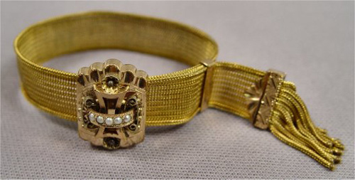 VICTORIAN SLIDE MESH BRACELET: Yellow rolled gold bracelet with etched slide with attached wire, ball and seed pearl decorations, etched straight bar and end cap with fringe ending in tiny balls. Approx. 7'' at its longest, 5/8'' wide.