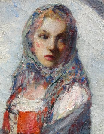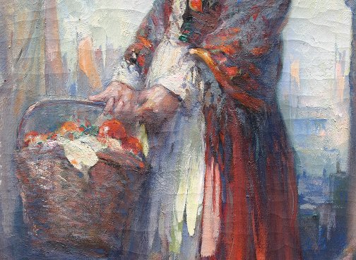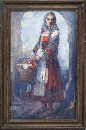 PAPE, Eric, (American, 1870-1938): Apple Girl, O/C, 30'' x 18'', signed, period frame, 34'' x 22''. Craquelure throughout.