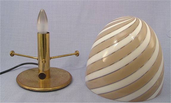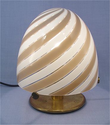 MAZZEGA MURANO ART GLASS LAMP: Domed, swirl striped shade rests on a silver socket base. Bears the AV Mazzega label. 8''h, the shade is 9'' dia.