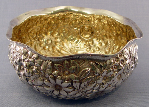 GORHAM STERLING REPOUSSE BOWL CA. 1888: Deep repousse, date mark for 1888. 3 1/2''h, 8 1/4'' dia. Approx. 420 grams or 13.5 oz. Monogram on underside.