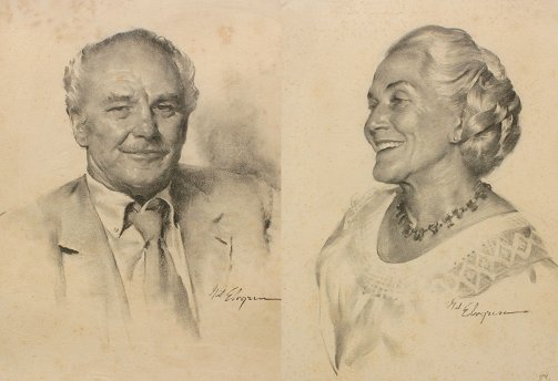 ELVGREN, Gil, (American, 1914-1980): CHARCOAL PORTRAITS OF THE MCKINNONS, 23'' x 17'', signed, matching gold frame with wear, 29'' x 23''. Sporadic foxing. Est. $800/1200**