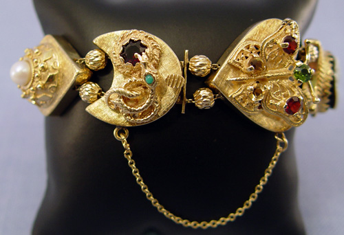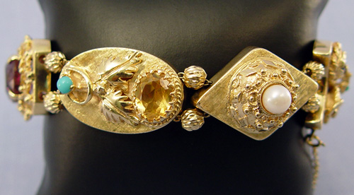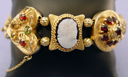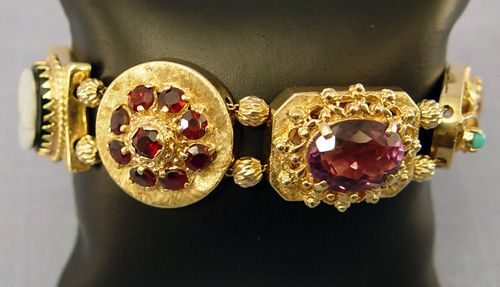 14K GOLD SLIDE BRACELET: Antique style slide bracelet created by seven yellow gold slides set with garnets, amethyst, citrine, pearl, turquoise and a two tone cameo. Clasp marked 14k, all slide acid test 14k, safety chain, 8 1/2''l., 64.8 grams.
