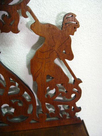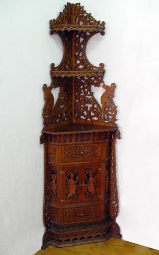 TWO PART WALL MOUNT CORNER ETAGERE: Reticulated pierce carved corner shelf, the bottom section having drawers and doors. Note the Native Indian figural carvings. Approx. 70'' h. with both pieces, one section is 34''h, upper section is 36''h. Est. $600/800**