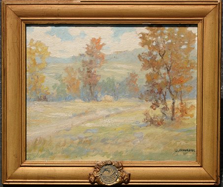 IMPRESSIONIST MEADOW SCENE: O/B, 8 3/4'' x 11 1/2'', signed, gold painted frame with wear bearing applied medallion dated 1933, ''A Century of Progress, Chicago, Made in Czechoslovakia'', 12'' x 14'', illegibly signed. Several minor abrasions, needs cleaning.
