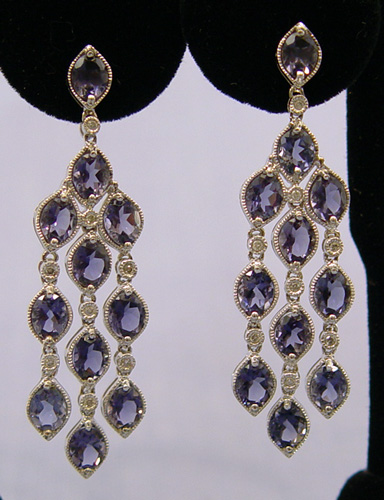 TANZANITE AND DIAMOND CHANDELIER EARRINGS: Matching the previous bracelet in design with marquise cut tanzanite and tiny round diamonds, set in 18k white gold, marked 750, post findings with large backs, 2''l., 10.6 grams. Est. $1800/2500**
