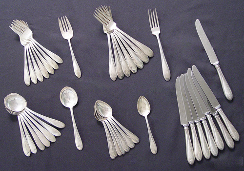 CONCORD YANKEE CLIPPER STERLING FLATWARE SERVICE: 40 pieces to include 8 each of dinner knives (8 3/4''), 8 dinner forks, 8 salad forks, 8 soup spoons and 8 tea spoons. Monogrammed M or W.